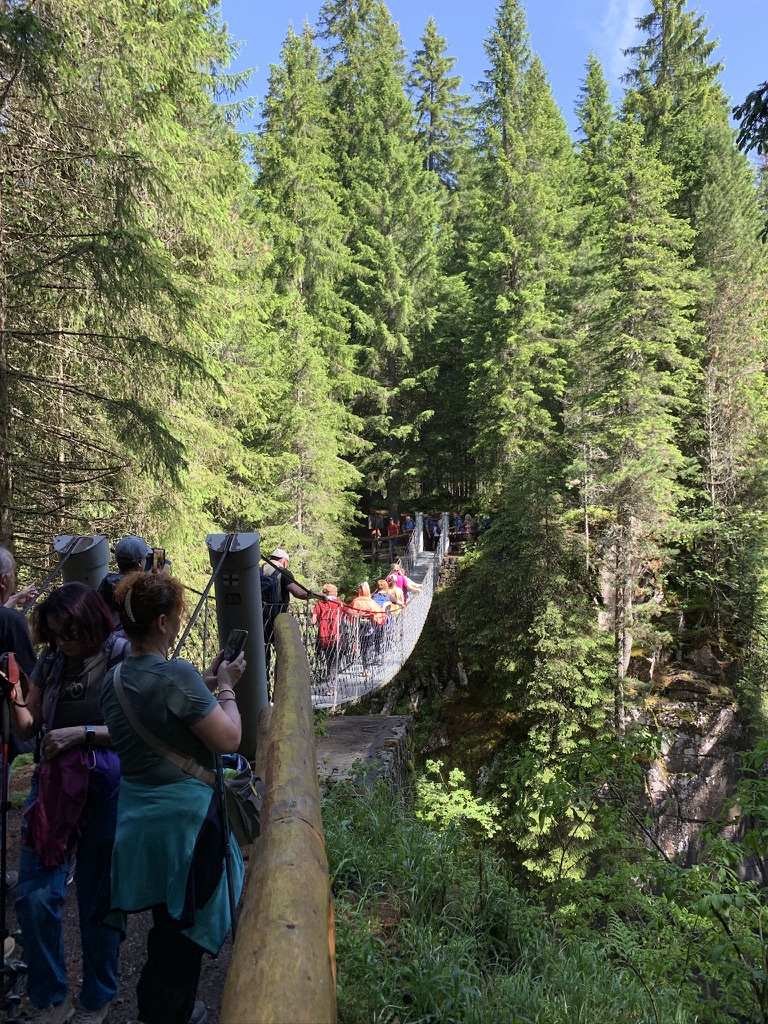2) A walk along the Marciò trail through the Forest of the Violins, where the wood for great violins such as Stradivarius comes from. We had to go over a small Tibetan bridge to cross the Travignolo Torrent, then we continued on to the deer reserve, an enclosed protected area which as been use to help re-populate deer in the mountains. We took a bus to another area and hiked to a rifugio where we enjoyed polenta with goulash for lunch.