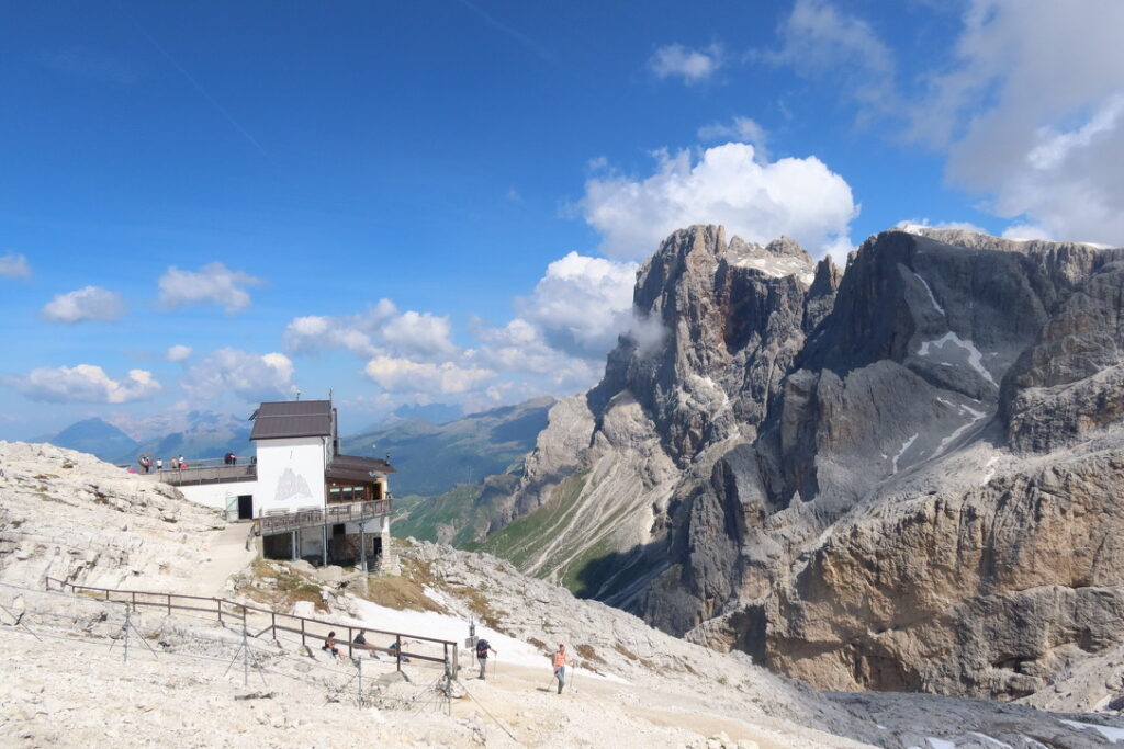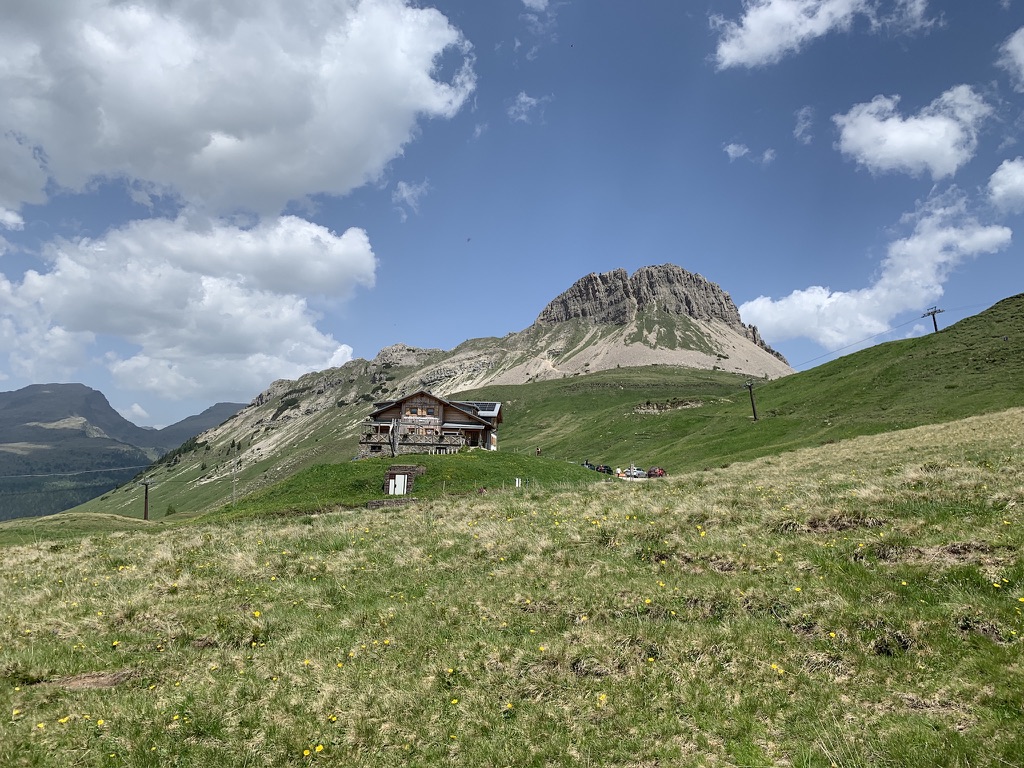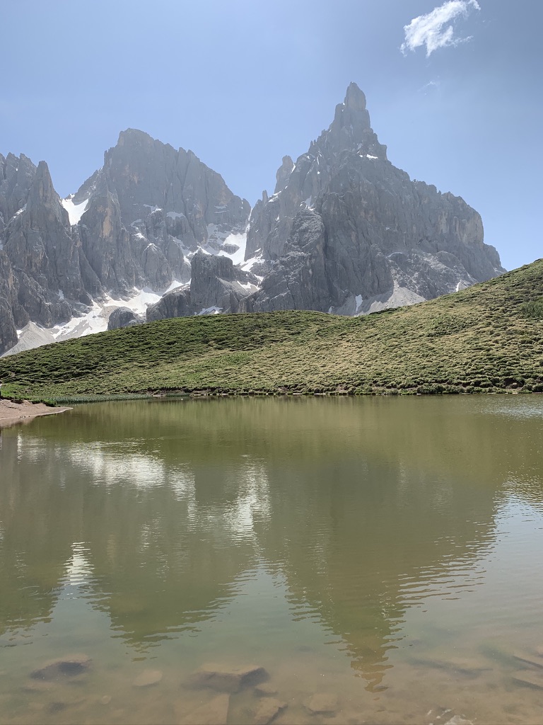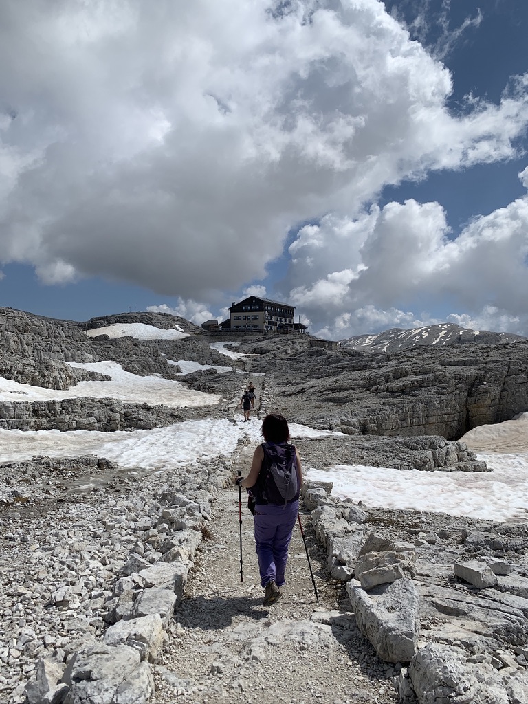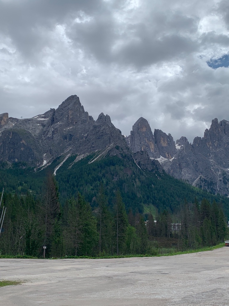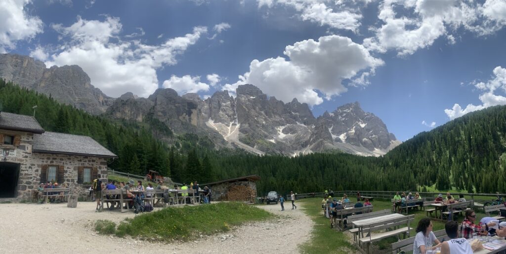 1) A hike from Passo Rolle to laghetto Baita Segantini. This was on winding roads that were not too steep. We had packed a lunch, so when we stopped a rifugio, we just got some beers and found a place in the shade to enjoy them with our sandwiches. We were lucky to have found a spot under the eves as the clouds rolled in after we had finished eating and there was a storm that started with rain but soon turned to hail.