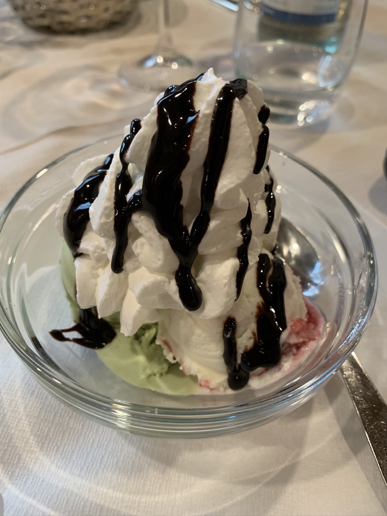 3) Thursday was our last day. We took the funicular up the mountain and hiked to the rifugio Rosetta. The temperature was perfect, not at all cold, although there was snow on the ground in some areas. We made a mental note to bring our slip-on ice cleats that we picked up during our year in Michigan on our next green week. We didn’t venture up to a few spots because we were worried about slipping on the ice, especially on the way down. After a bit of exploring, we noticed the winds were changing and some dark clouds were blowing in so we hiked back to the lift. We did stop at the restaurant there for a sausage sandwich and beers before taking the funicular down.