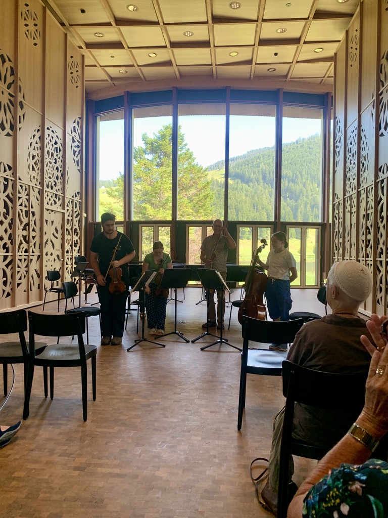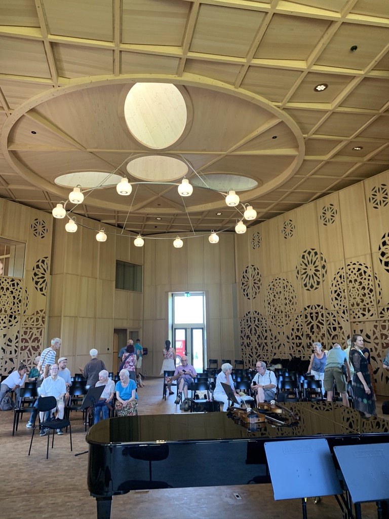 Over the last few years, they have been working on a new music hall next to the lake, the Klanghaus, which they finished this Spring. It is a beautiful building, and when we visited last year it piqued our curiosity. As luck would have it, they had a number of concerts scheduled, and on Thursday we were able to attend a practice session for free. The musicians were all very good, but it was obvious that the ones who came later were more advanced. Their teachers were there to guide them through the various scores, and it was interesting to see the pedagogy in action. The interior rooms are intricately designed. When we returned from the “concert” Ute had made a delicious mushroom soup with the chanterelles and some other mushrooms Winnie had found.