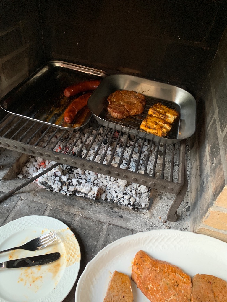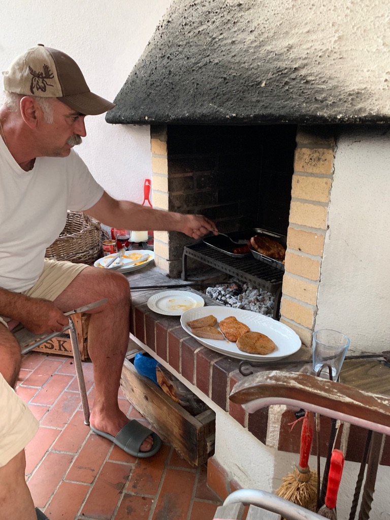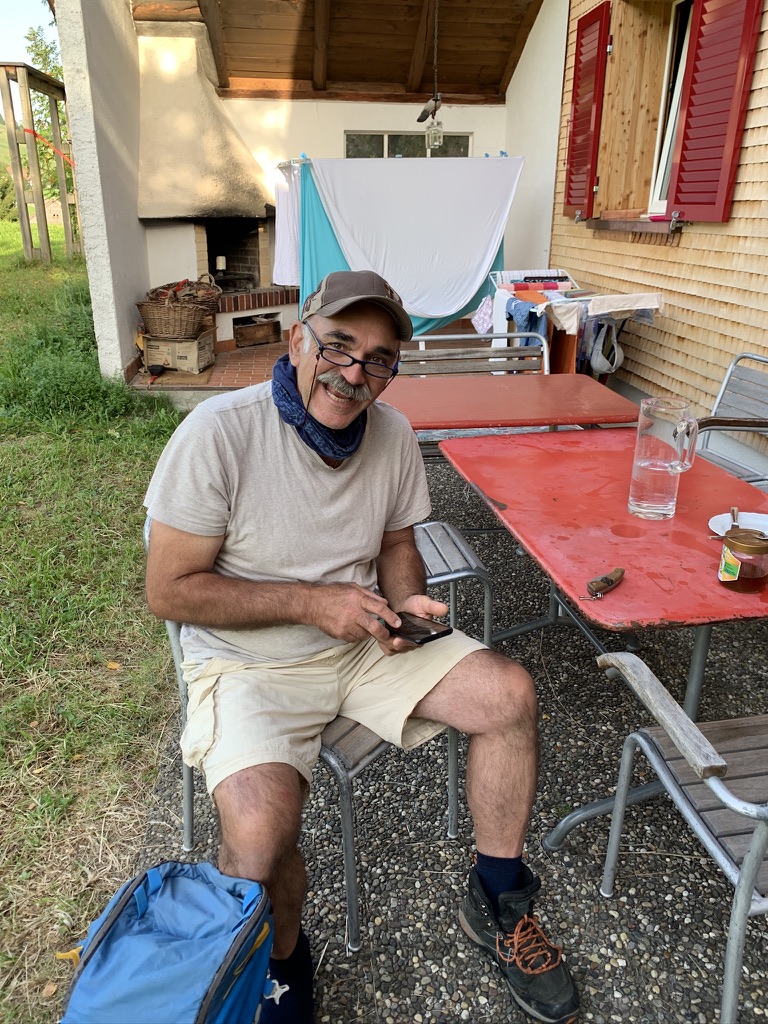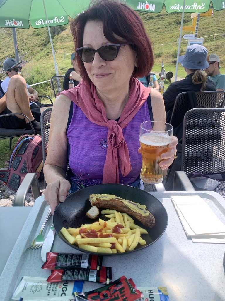 On Saturday we decided to take the lift up the mountain. The restaurant at the top is cafeteria style. We both had bratwurst and French fries with a beer. After taking the lift back down, we took a nice walk over to and around the lake before returning home. For dinner, Winnie grilled meat in the fireplace outside, Lorena made potato salad, and James and Ute did roasted eggplant and tomatoes. We also had some chili.