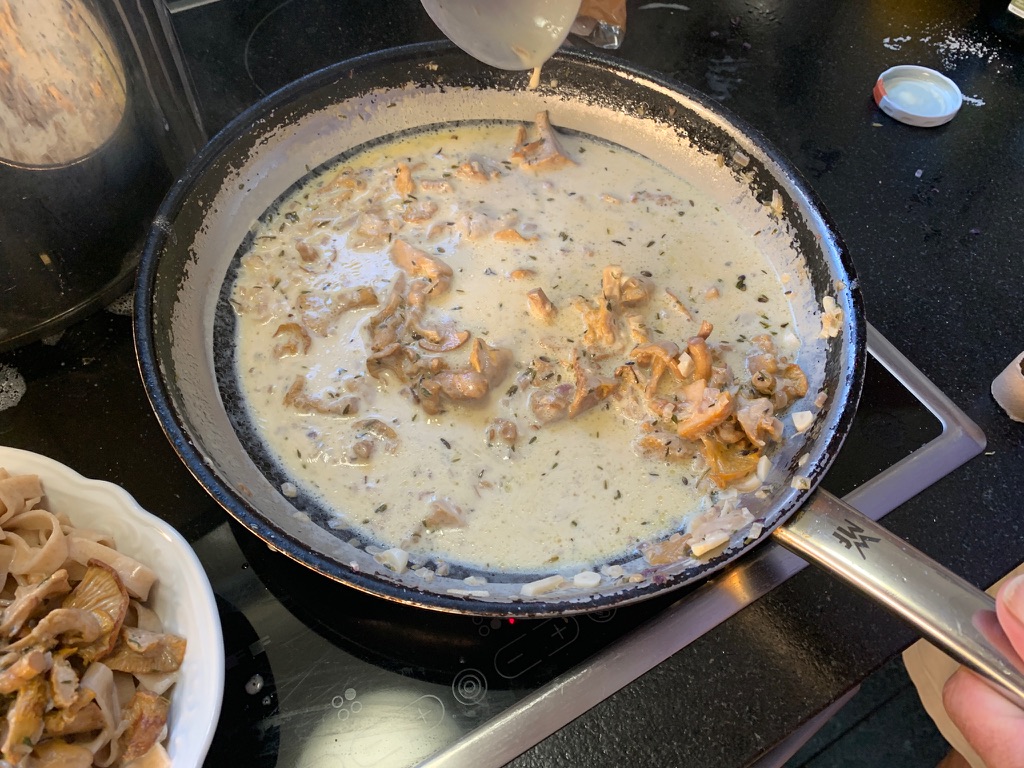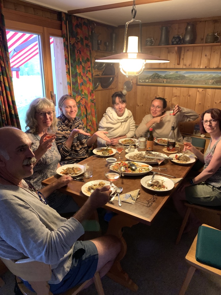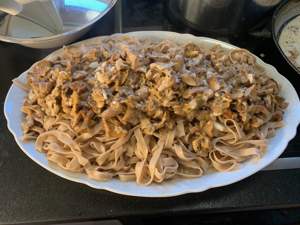 On Tuesday we made good time on the drive to Wildhaus. Every year we have noticed the Swiss Lachs as we passed through Lostallo. This year we decided to stop and check out their products. Coming from the Pacific Northwest, where you can get the best wild salmon on earth (next to Alaska), we weren’t sure what to expect. We have been disappointed with Atlantic salmon and Scottish smoked salmon. The shop was quite nice, and they had samples of the smoked salmon. It was delicious. They didn’t have any fresh salmon at the moment, so we bought a package of smoked salmon and a package of smoked salmon with lemon and pepper. It was so great to see our friends Ute and Winnie. Their three daughters, Marina, Elena and Lorena were also there, along with two friends from Germany, Luther and Karen. We spent the afternoon catching up. Winnie had already found a lot of mushrooms, so Ute made a delicious tagliatelle with chanterelles.