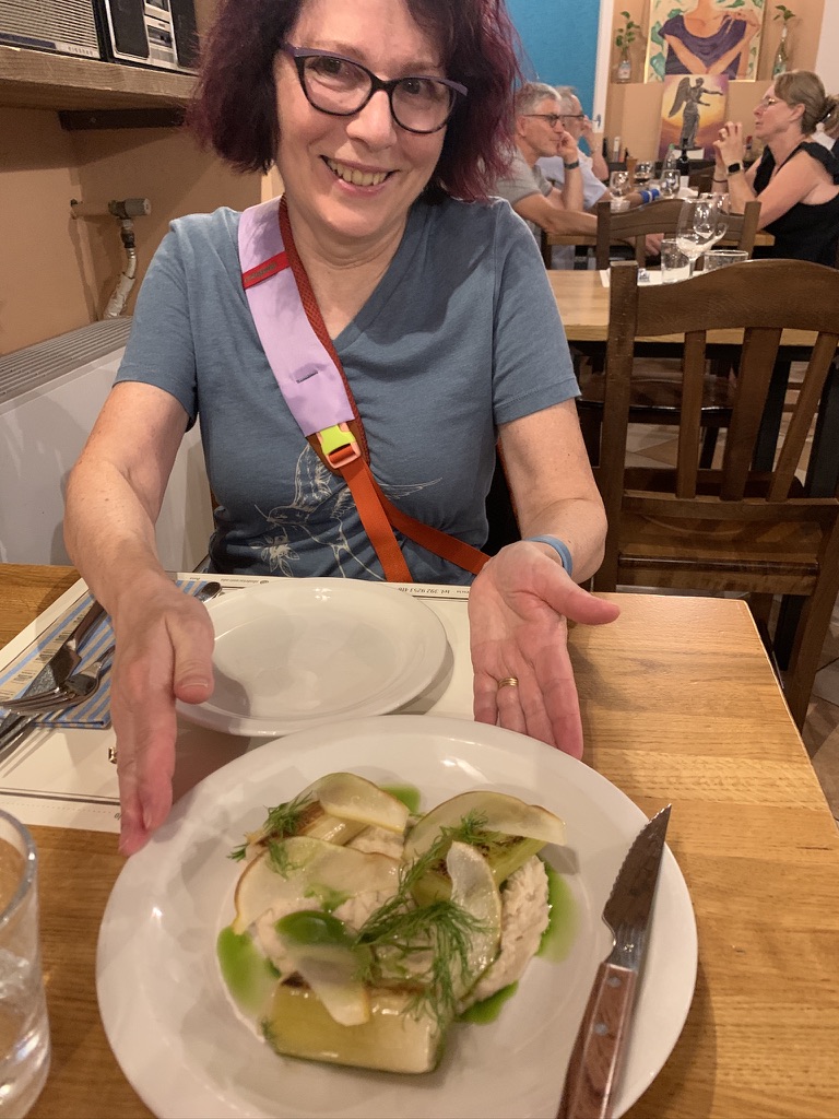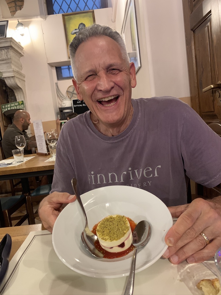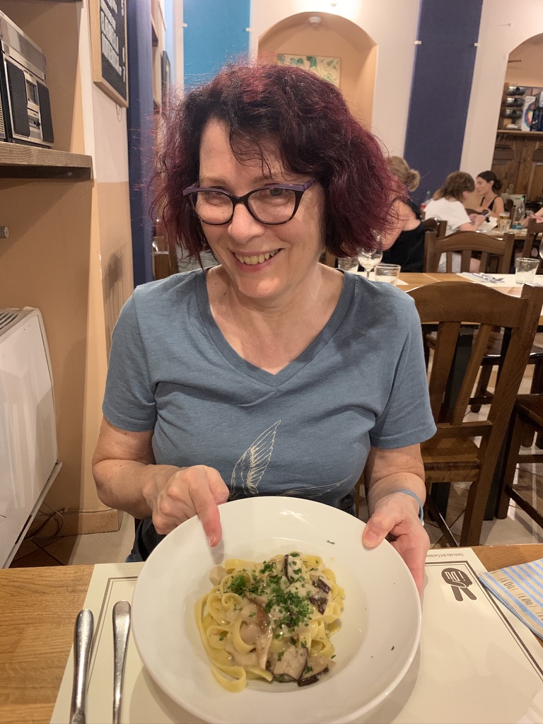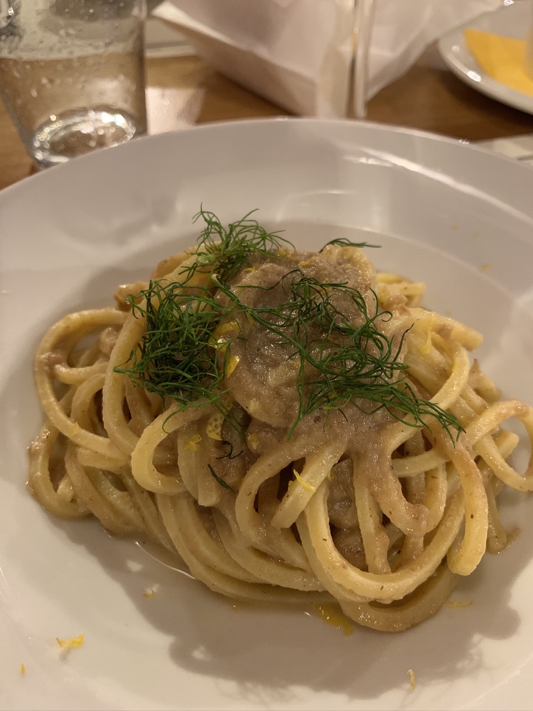 Finding an open restaurant in August can be a challenge. Fortunately James found a place that seemed promising and made a reservation. The Osteria I Dù della Contrada was a great choice. The restaurant itself is full of retro items such as typewriters, radios, sewing machines and a bicycle built for three. We split an appetizer of roasted leeks with pear and hummus. We both had a pasta. Virginia had tagliatelle with porcini mushrooms, James had Spaghetti alla chitarra with sardines, lemon and fresh dill. (Chitarra is a square shaped spaghetti from the Abruzzo region). For desert, we split a vanilla semifreddo with raspberry.