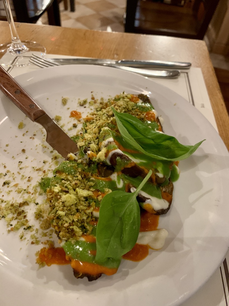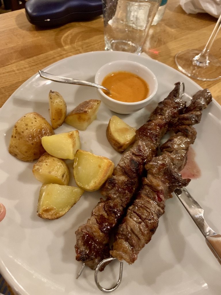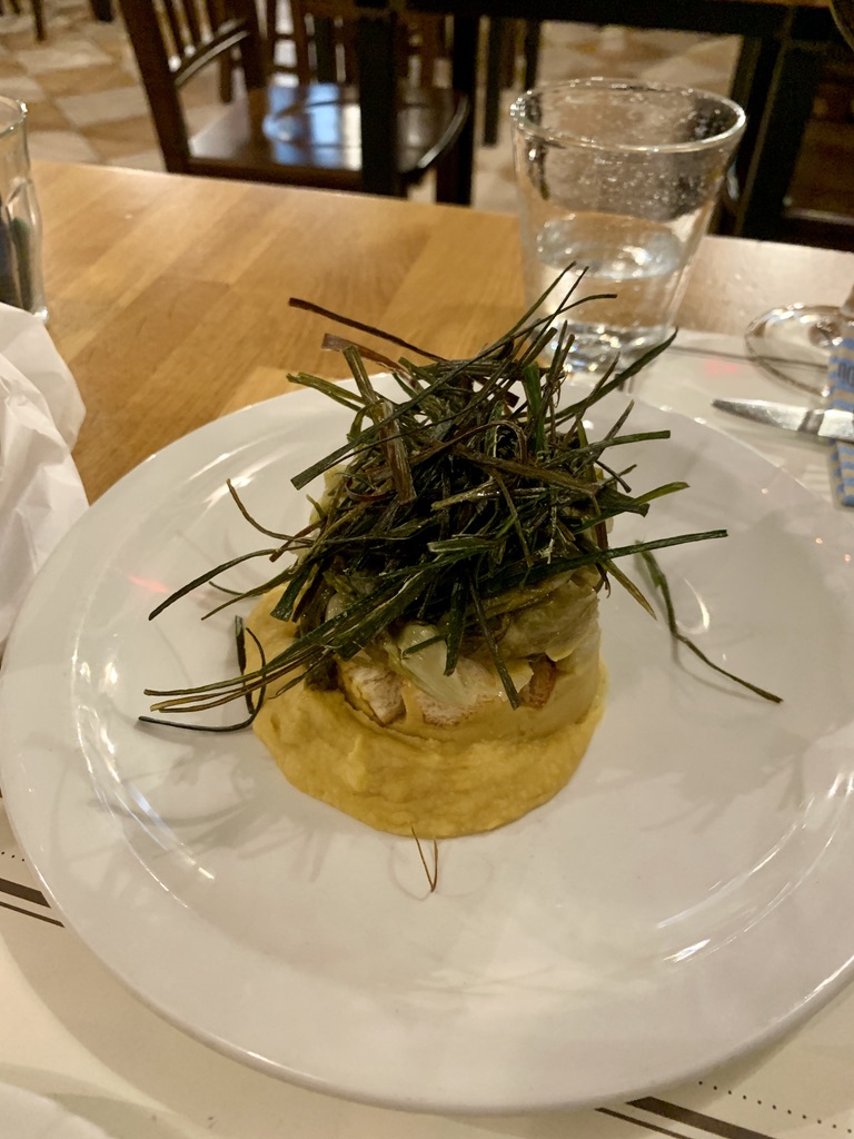 We had another excellent dinner at I Dù. For an appetizer, we shared an escarole timbale, which was escarole with hummus and. For the main dish, Virginia had Eggplant, non Parmigiana, which was basically delicious grilled eggplant with a tasty sauce, James had a beef Spiedoni (kebab) of beef that came with a salsa of strawberry and peppers on the side and roasted potatoes. We were too full to have dessert.