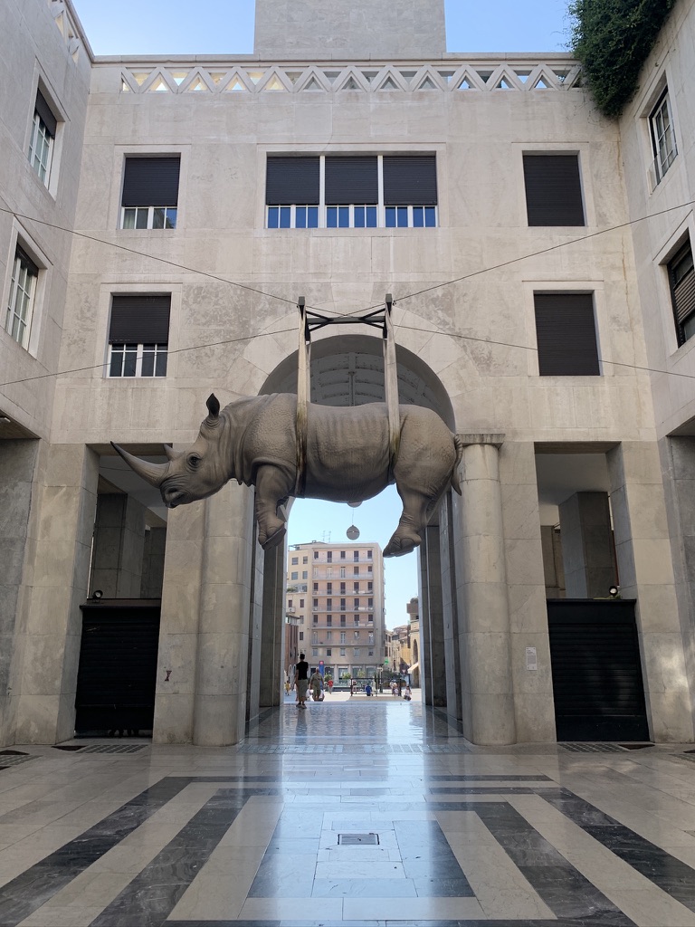 There is an interesting sculpture at the Torre della Rivolutione by the artist Stefano Bombardieri. it is of a life-size rhino suspeneded in the air. The title is Il Peso del tempo sospeso (The Weight of Time suspended), a metaphor for the human condition and the burdens we bear.