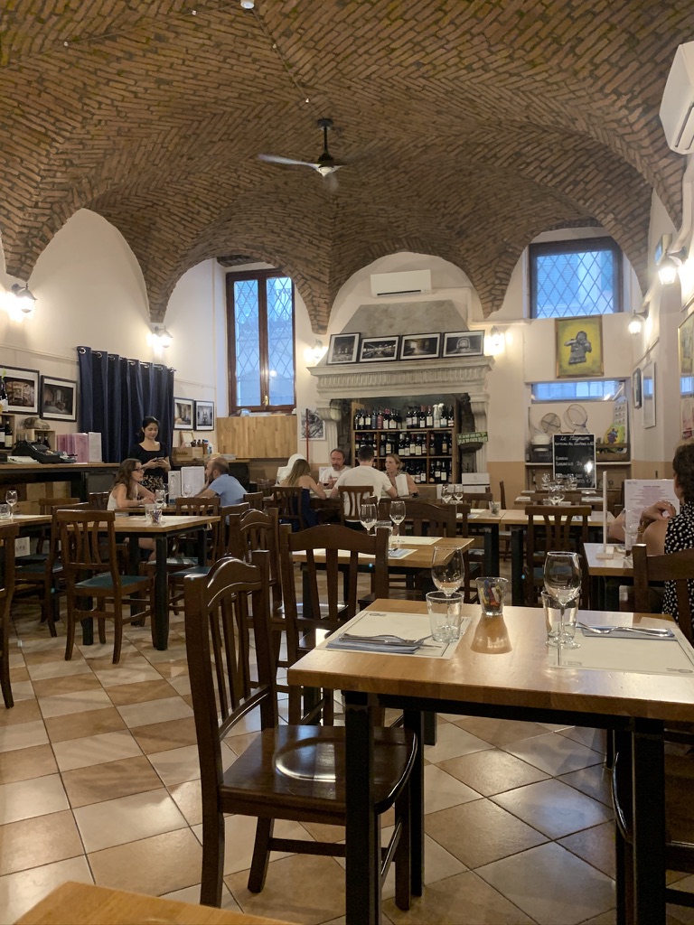 After leaving the archeological site, we stopped into San Zeno al Foro, a charming little church right next to the Capitolium. We also walked around town and along the pedestrian zone, Corso Cavour. We had hoped to find a restaurant that would be open for dinner, but no luck, everyplace we checked was closed for vacation. James decided to check with I Dù della Contrada and was able to get a table for 7:30 pm.