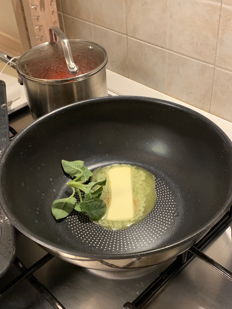 We were getting hungry by this point, so it was time to boil the water for the gnocchi. As this was boing, we also put the butter and sage in a pan for the sage butter sauce. When the gnocchi come to the top they’re done.