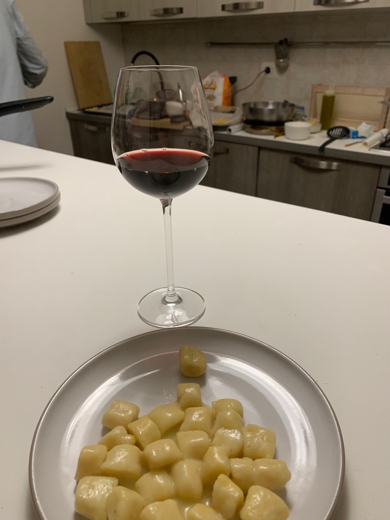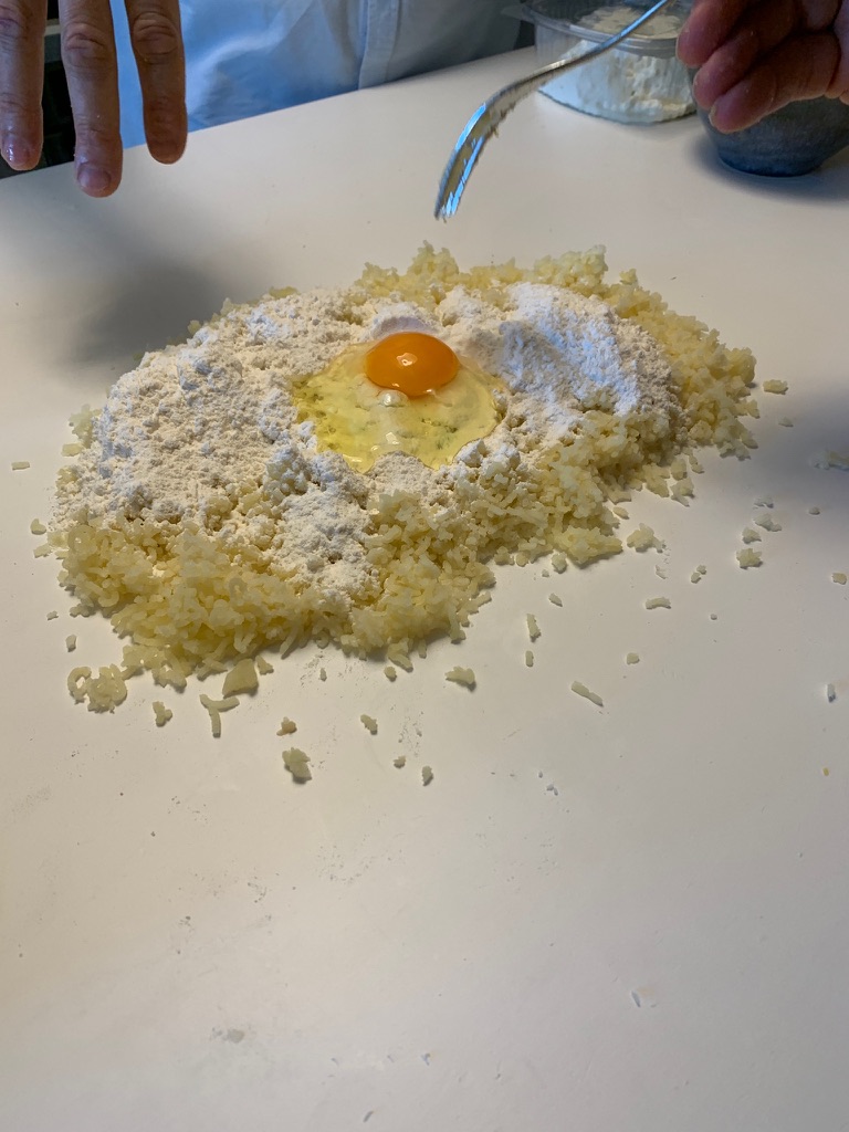 As the Ravioli rested, we made gnocchi. Ismaele recommended using red potatoes, cooking them with the skins on, and letting them cool in the fridge. We used a ricer, then added the flour and egg. Once they were the right consistency, we took small sections, rolled them and then cut them. It was a bit like playing with Play-doh.