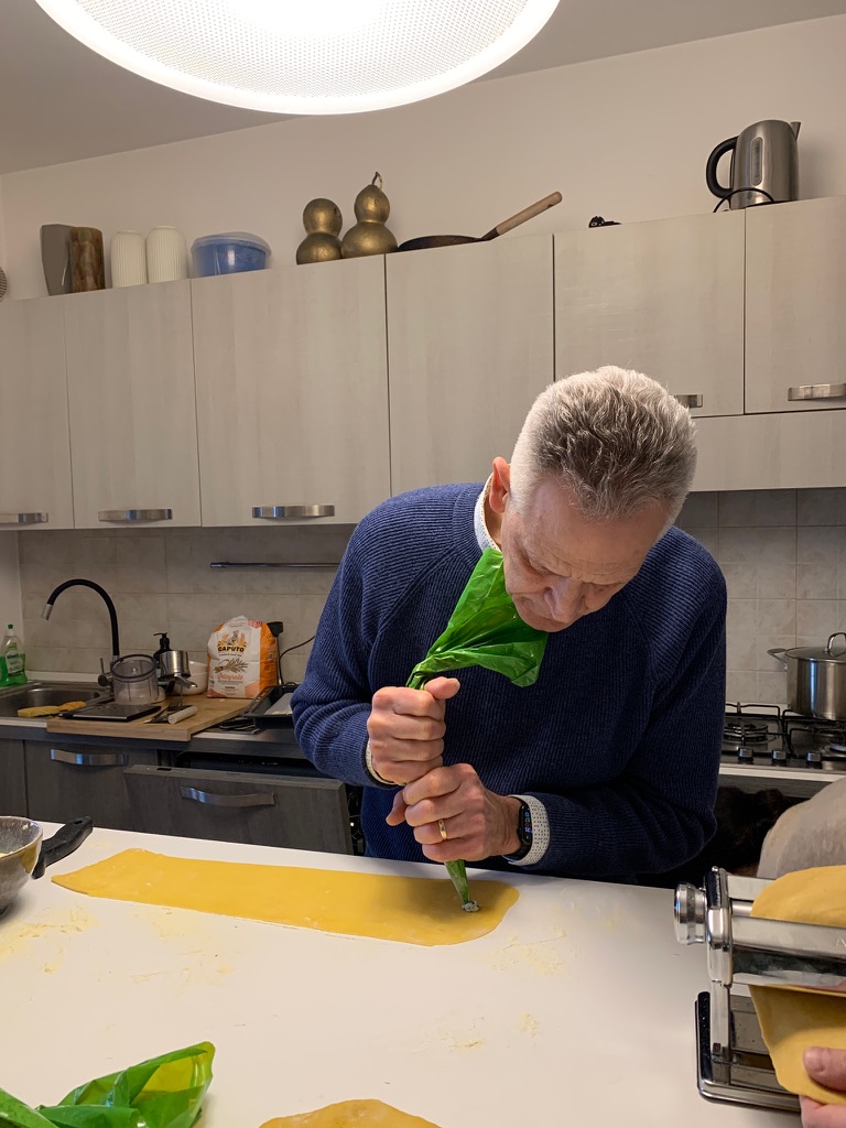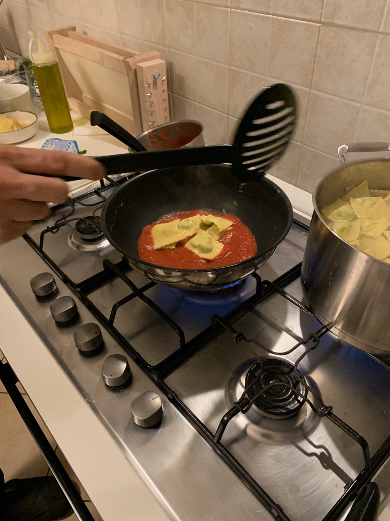 After we made the pasta, we made Ravioli and Plin. Plin are shaped a bit differently because they are pinched at the ends. We usually see them in Northern Italy.