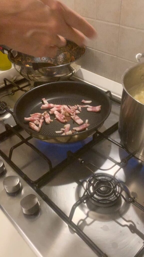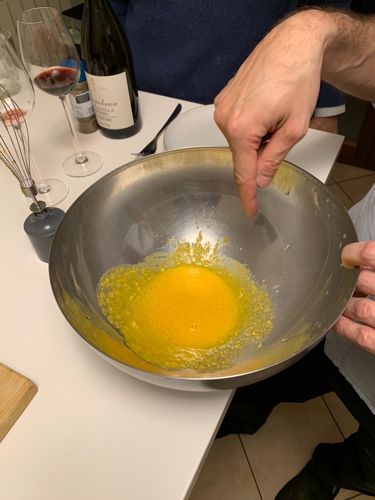 We finished by making a carbonara sauce for the spaghetti alla guitarra. Scramble the egg, add a bit of salt, some of the pasta cooking water, then the cooked pasta. Top with guanciale. We enjoyed the meal with a glass of valpolicella