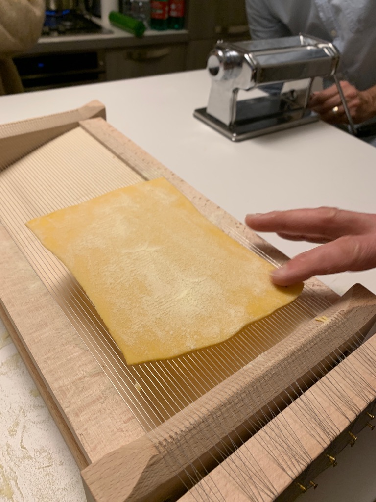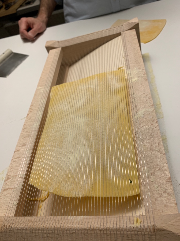 The last pasta we made was spaghetti alla guitarra. For this one, we took the pasta sheet and laid it on a “guitarra”, then used a rolling pin to roll the dough through the “strings”. To release the dough, you pluck the “strings”. For this pasta, we had made a dough made with semolina flour.