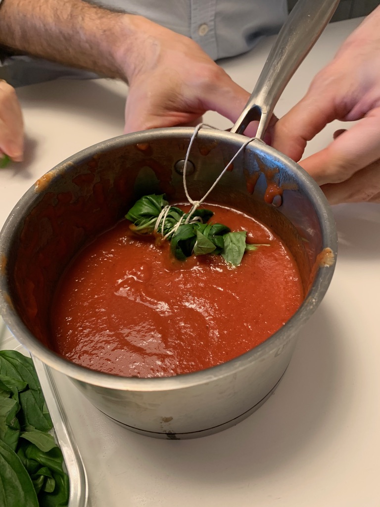 Our next step was to make the sauces. For the Ravioli we made a tomato basil sauce. We used roasted cherry tomatoes along with some diced tomatoes and whirred them in a mini blender. Instead of chopping up the basil and adding it to the sauce, Ismaele made a bouquet garni with the basil and tied it to the handle. Very clever.